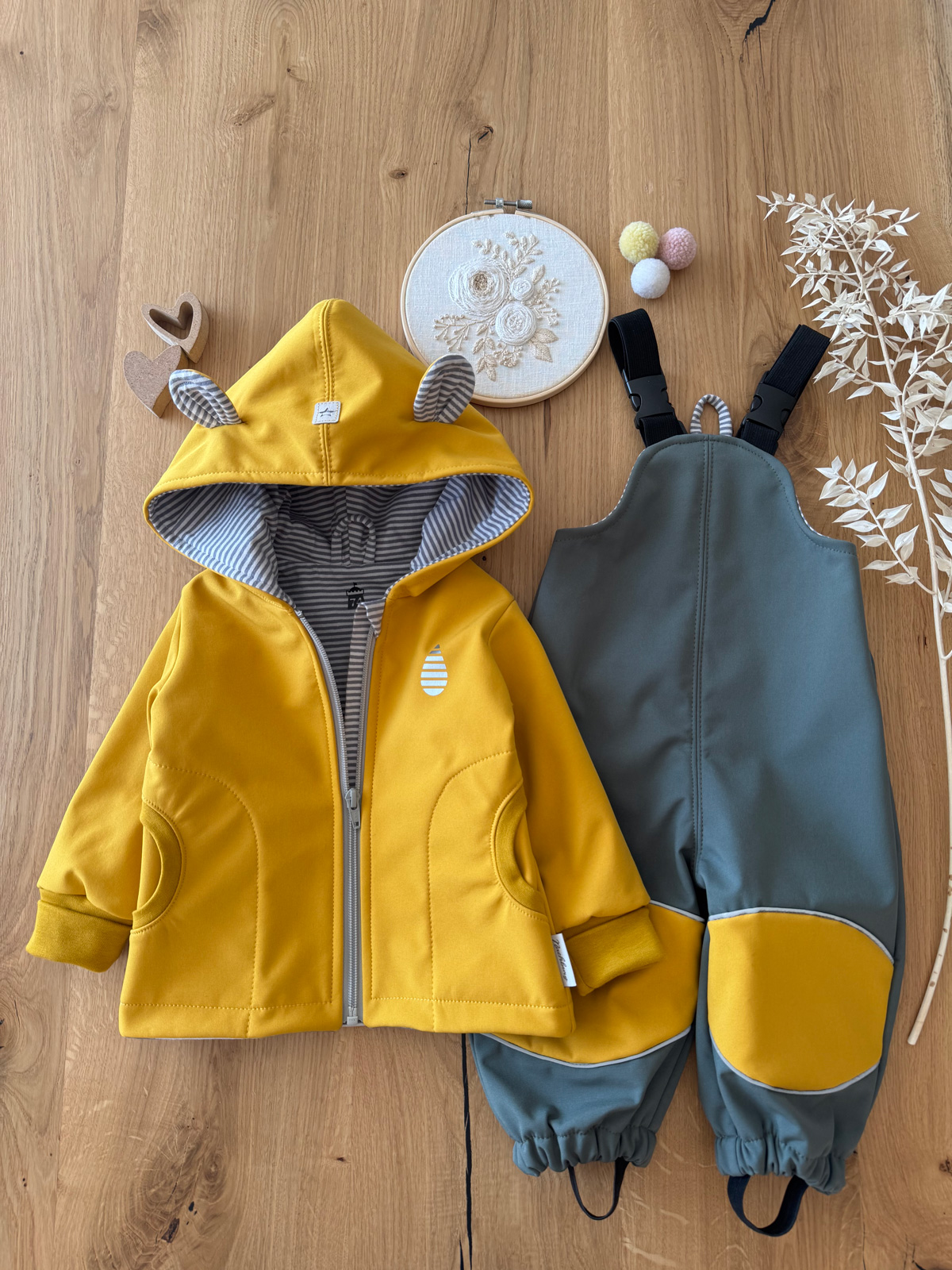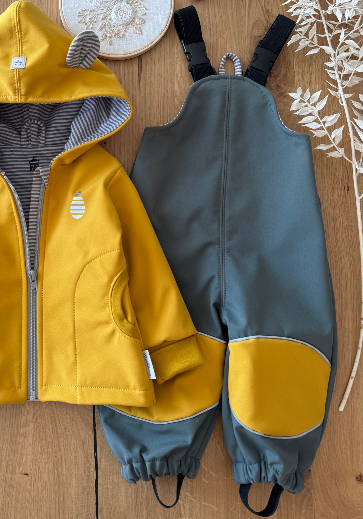 Praktische Matschhose aus Softshell für die kleinen Abenteurer! Diese Hose in einem schönen Grün-Oliv-Ton ist perfekt für Matsch, Schlamm und alle Outdoor-Abenteuer. Hier kommst du zur passenden Jacke dazu- Softshelljacke Senf Gr. 74