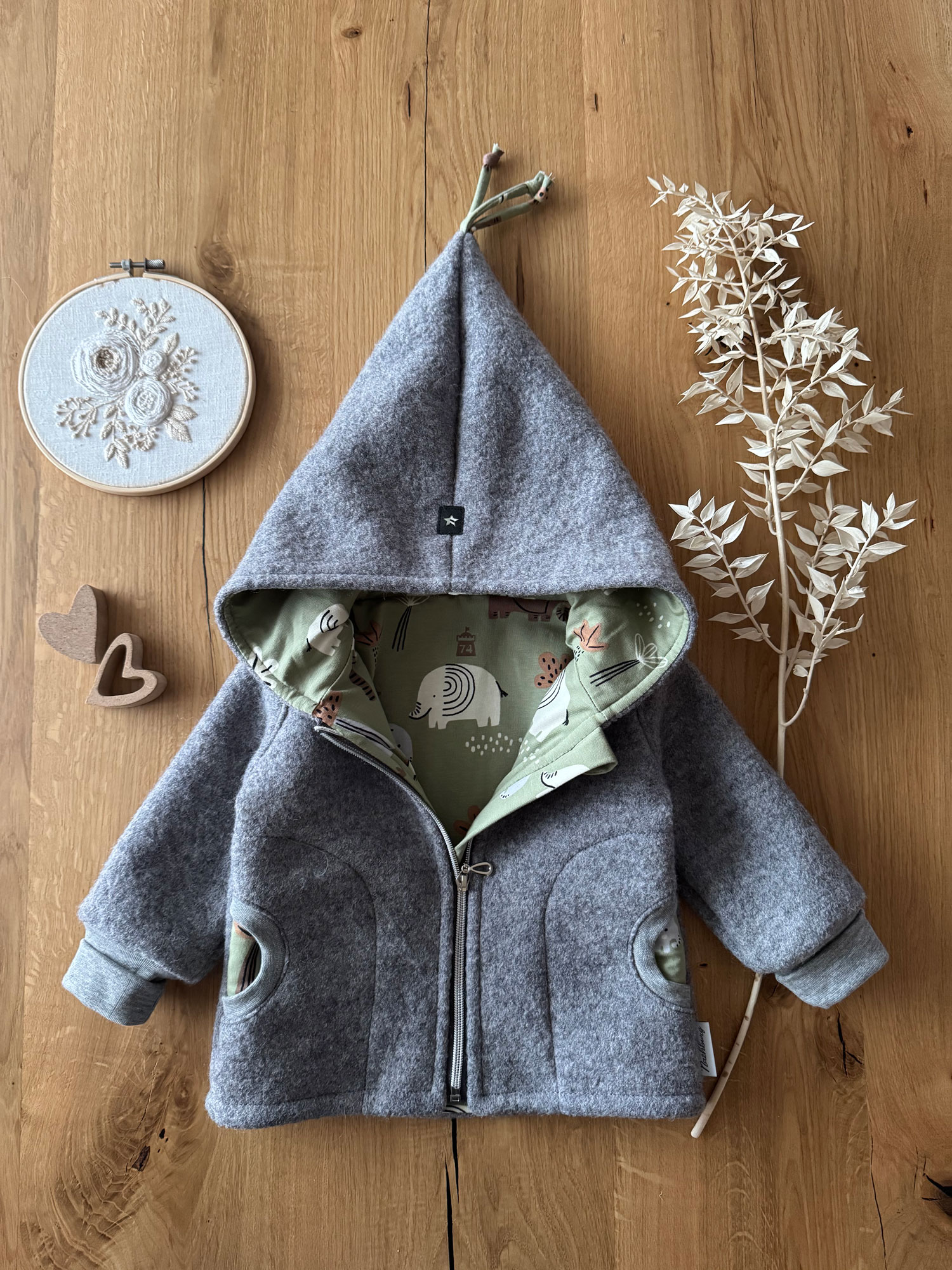 Diese Walkjacke ist aus Wollwalk, 100% Schurwolle und gefüttert mit dem Baumwoll-Jersey Elefanten auf Grün.