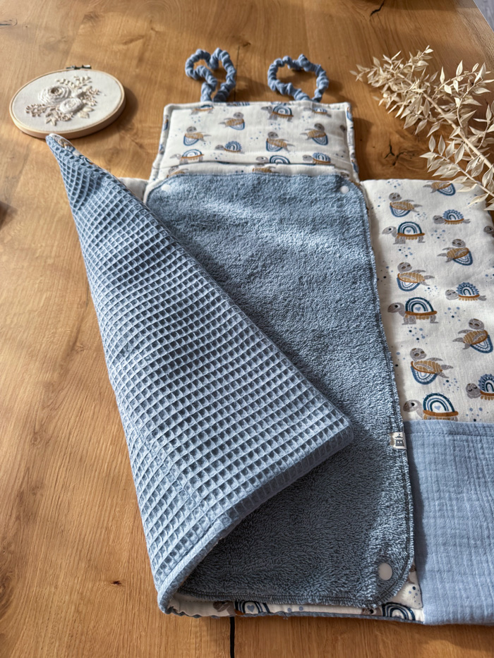 Dazu gibt es noch ein Handtuch in der Mitte 45 x 25cm das durch Druckknöpfe befestigt ist und zum Waschen ganz einfach abgemacht werden kann. Und die Möglichkeit auch ein solches Zweites zum Wechseln dazu zu bestellen, jetzt auch mit Molton-Unterseite.