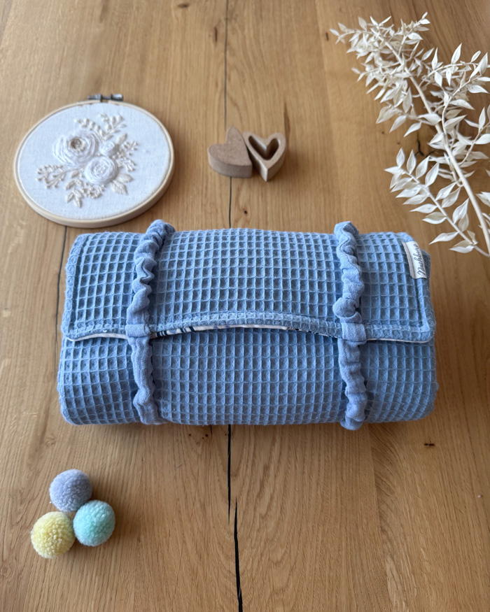 Außen aus verschiedenen Farben vom Waffelpique und innen Musselin oder Baumwolle mit Muster, immer 100% Baumwolle mit weicher Vliesfüllung. Diese hier angeführte „Viki“ ist sofort lieferbar.
